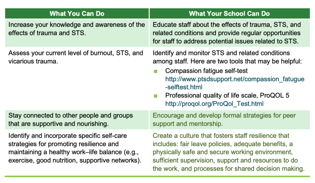 A number of individual and system-level strategies effectively promote staff self-care and resilience. This section includes the following tools for supporting individual and schoolwide strategies for addressing and minimizing the effects of STS and related conditions: